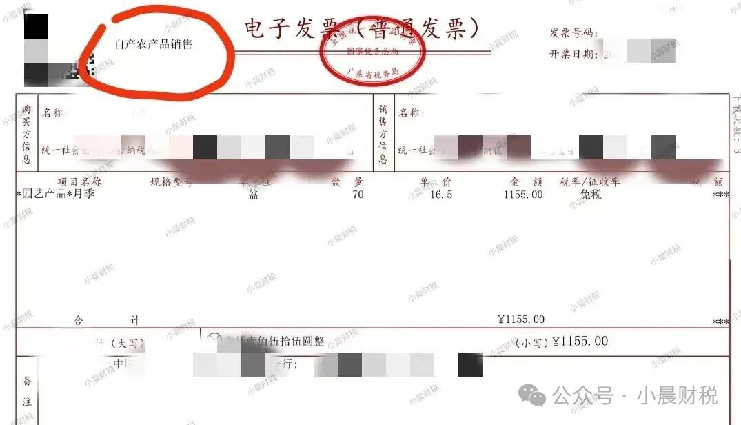 啥是农产品归类?用一句大白话说,就是税局给您开通开具“自产农产品销售”发票的功能,您提交相关资料证明您有自产农产品的资质能力,税局审核通过后,会给您开通“自产农产品销售”的类别,在“特定业务”下拉链那里就可以选择“自产农产品销售”开具农产品免税发票。开具出来的发票,发票左上角就有“自产农产品销售”标识。发票如下: